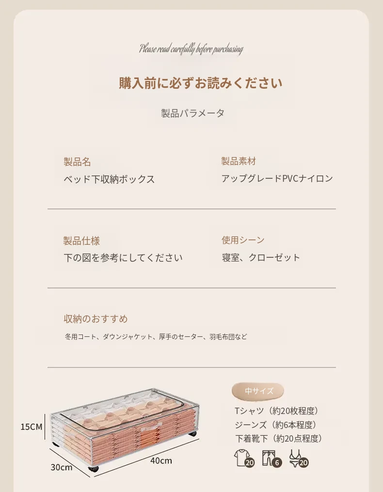 中サイズ【40*30*15cm】(夏服約60着または冬用毛布5枚収納可能)